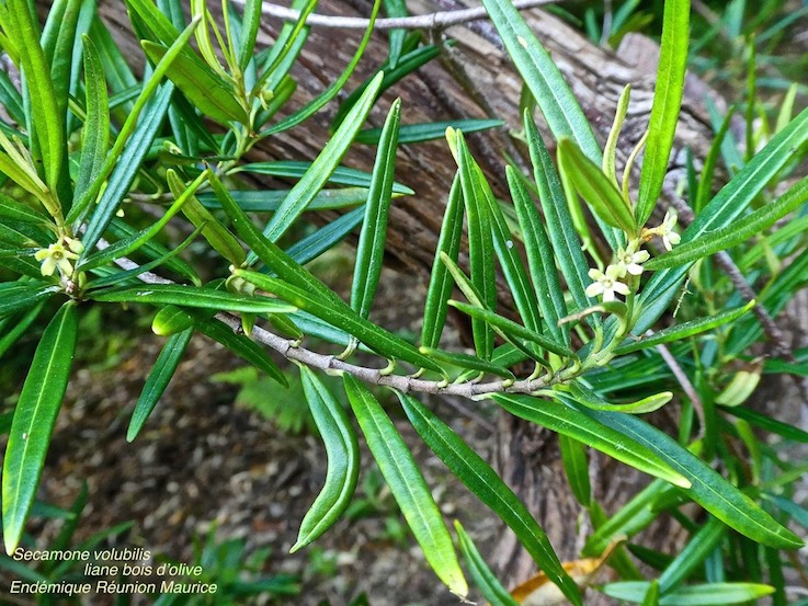 Secamone volubilis (Lam.) Marais, la Liane bois d'olive appartient à la famille des Apocynaceae à la sous-famille des Secamonoideae et au genre Secamone qui comprend environ 100 espèces originaires des régions tropicales et subtropicales de l'Ancien Monde.