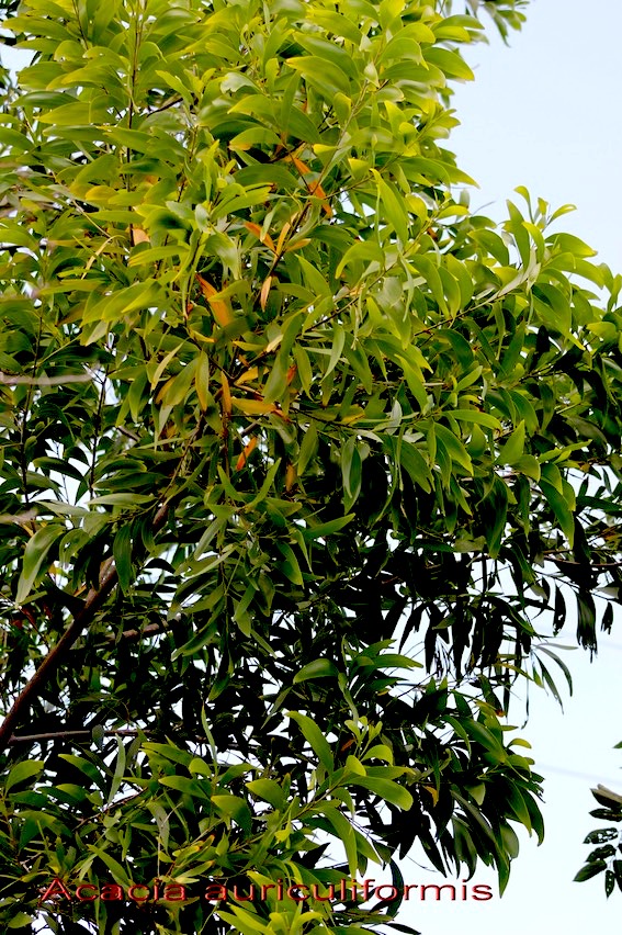 Acacia auriculiformis est un arbre à feuilles persistantes qui pousse jusqu'à 30 m de haut et 50 cm de diamètre1. Le tronc est tordu et l'écorce fissurée verticalement. Les racines radiales sont peu profondes.