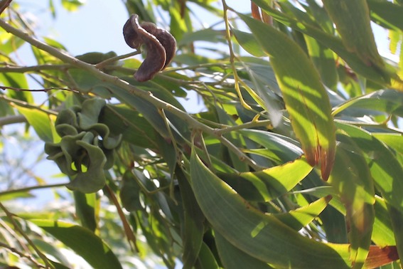 Il a un feuillage dense avec une couronne étalée ouverte. Les feuilles, alternes, sont des phyllodes falciformes, de 8 à 20 cm de long et de 1 à 4,5 cm de large, avec trois à sept nervures longitudinales bien marquées. C’est une espèce sempervirente.