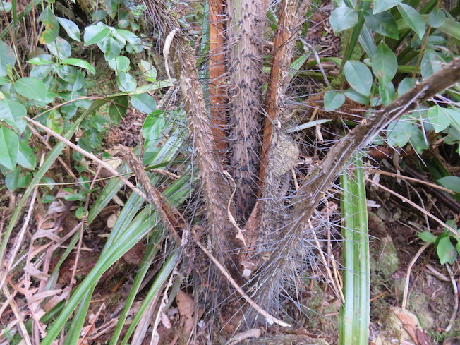 Les feuilles alternes et étalées sont grandes, la base au niveau de la gaine est garnie de grandes épines noires de 5 à 10 cm de longueur, le limbe porte aussi des épines.