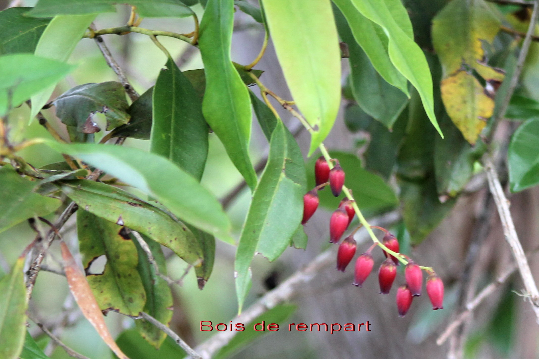 Sans lever la tête, on peut reconnaître l'existence d'un Bois de rempart au seul fait de trouver sur le sentier de petites corolles en grelot rouge a base blanche. Elle désigne un arbre pionnier, qui comme le Bois de fer bâtard, fut un des premiers a coloniser une coulée de lave avec ses petites graines dispersées par le vent. On les reconnaît presque toujours à leur écorce et à leur bois de couleur rousse. Cette écorce a des crevasses verticales un peu comme celle du Camphrier. De nombreuses parties de cet arbre sont extrémement toxiques (indig. Réu. Mau. Madag. Afr.) Guide de Mare Longue (ONF)