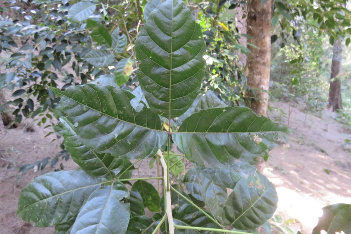Trifoliolées, pratiquement glabres (pubescence très éparse sur les nervures sur la face inférieure). Foliole médiane au limbe elliptique [?] ou légèrement obovale, acuminé [?] au sommet, cunéiforme [?] à la base, les 2 folioles latérales plus petites, à base asymétrique ; domaties