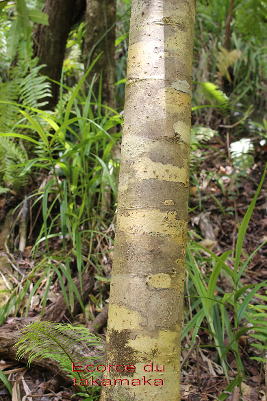 Le Takamaka, que l'on reconnait à son écorce jaunâtre, est un arbre a latex. Ses feuilles, opposées, ont des nervures très nombreuses, parallèles entre elles et serrées (endém. Réu. Mau.)
