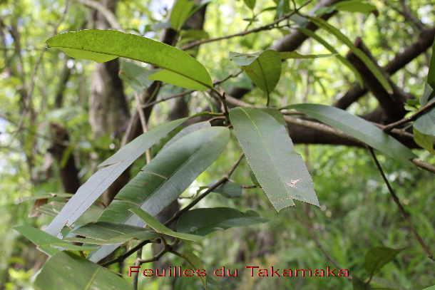 On reconnait facilement le Takamaka a son tronc rectiligne et son écorce jaunâtre avec des taches brunes (lenticelles*). Ses feuilles opposées sont coriaces et caractérisées par des nervures latérales parallèles, très nombreuses et très resserrées. Son fruit est vert et contient une graine volumineuse. La sève de cet arbre en donnant une gomme qui fut exportée au XVlIle siècle. Réu. Mau.)