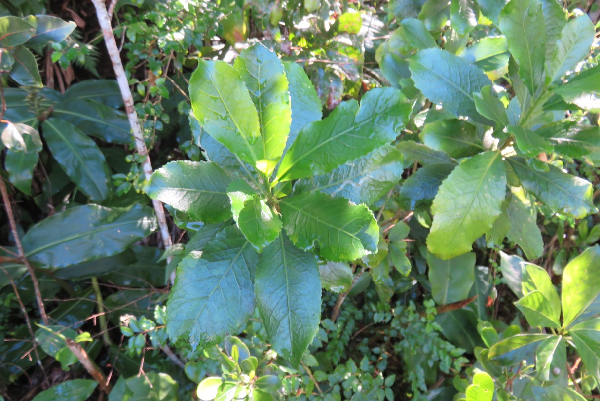 Les feuilles simples, alternes, pétiolées sont plus ou moins groupées vers le sommet des ramilles. Le pétiole, glabre, droit mesure de 2 à 10 mm de longueur, il est habituellement canaliculé du côté supérieur, avec parfois des dents cordées, très petites au sommet. Les stipules sont très petites, cornées, rapidement caduques. Le limbe est obovale à obovale elliptique de 3 à 10 cm de long et de 1 à 2.5 cm de large, au sommet aigu ou obtus, parfois acuminé ausommet, à base étroite plus ou moins arrondie, habituellement glabre. La nervure médiane est plus ou moins proéminente, la nervation secondaire un peu moins en relief. Les marges variantes sur un même pied de serretées à plus ou moins entières.