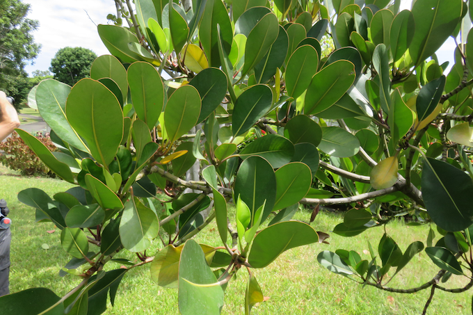 Les feuilles simples, entières, opposées sont pétiolées. Le limbe coriace est obovale, vert foncé de 8 à 20 cm de long. La Marge est entière, la nervure centrale proéminente.