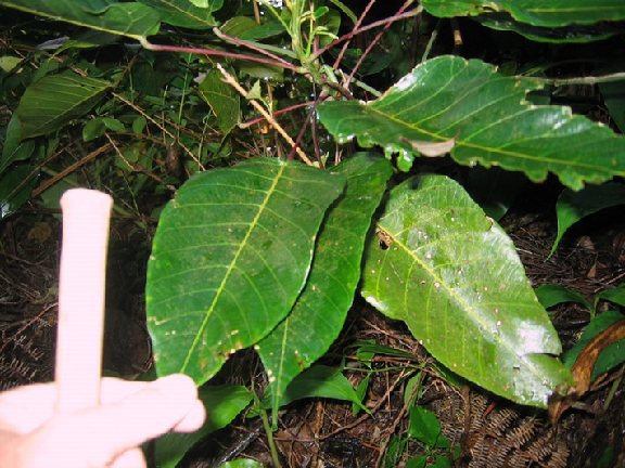 Simples, entières, insérées en hélices groupées au sommet des ramilles. Pétiole variant de 2 à 20 cm de longueur, renflé à la base. Limbe ovale, aigu et généralement acuminé au sommet, très largement cunéiforme [?] Proéminentes sur les jeunes ramilles. Axillaires ou terminales, les mâles en racèmes ou en panicules, les femelles en racèmes [?] pauciflores [?] Fleurs mâles: périanthe [?] à 3 sépales valvaires; pétales et disque absents; étamines très nombreuses. Fleur femelle: périanthe [?] Capsules [?] Grandes, arrondies, brillantes de couleur brun sombre. Endémique, de La Réunion et de Maurice. Restauration écologique.<CIRAD