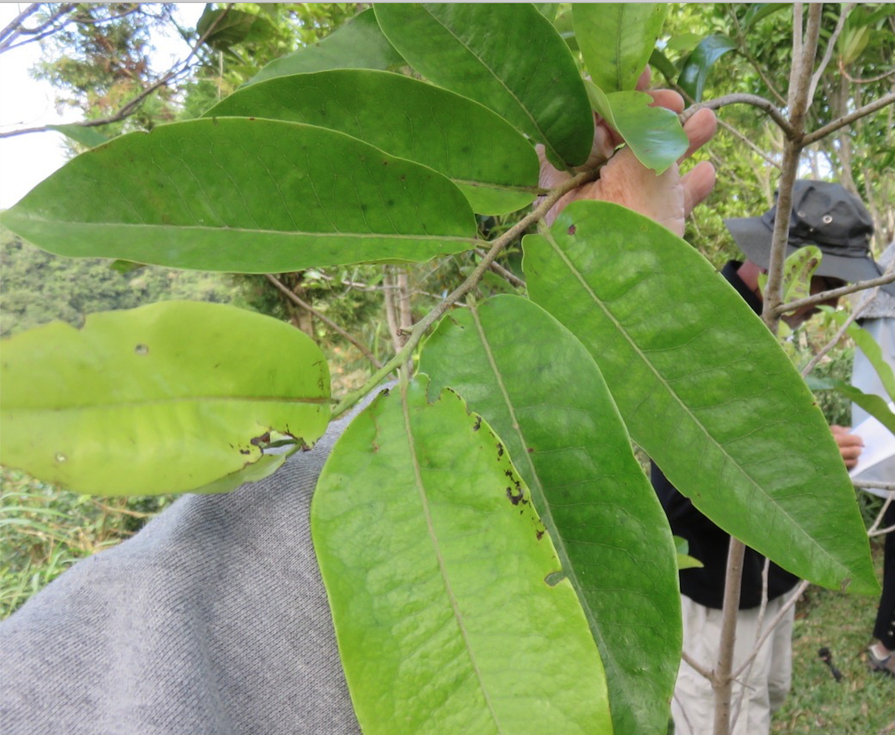 Simples, alternes, entières, sans stipule, glabres sur les deux faces. Feuilles jeunes vert clair, luisantes, devenant vert foncé et tachetées de noir en vieillissant ; limbe coriace, elliptique [?] Secondaires saillantes sur la face supérieure.