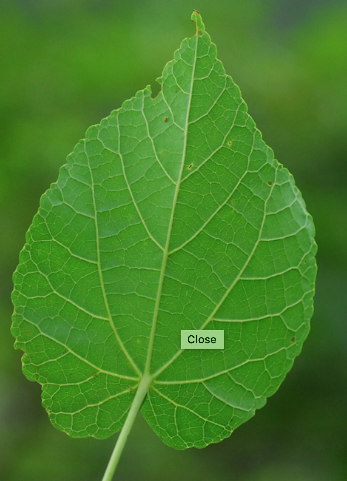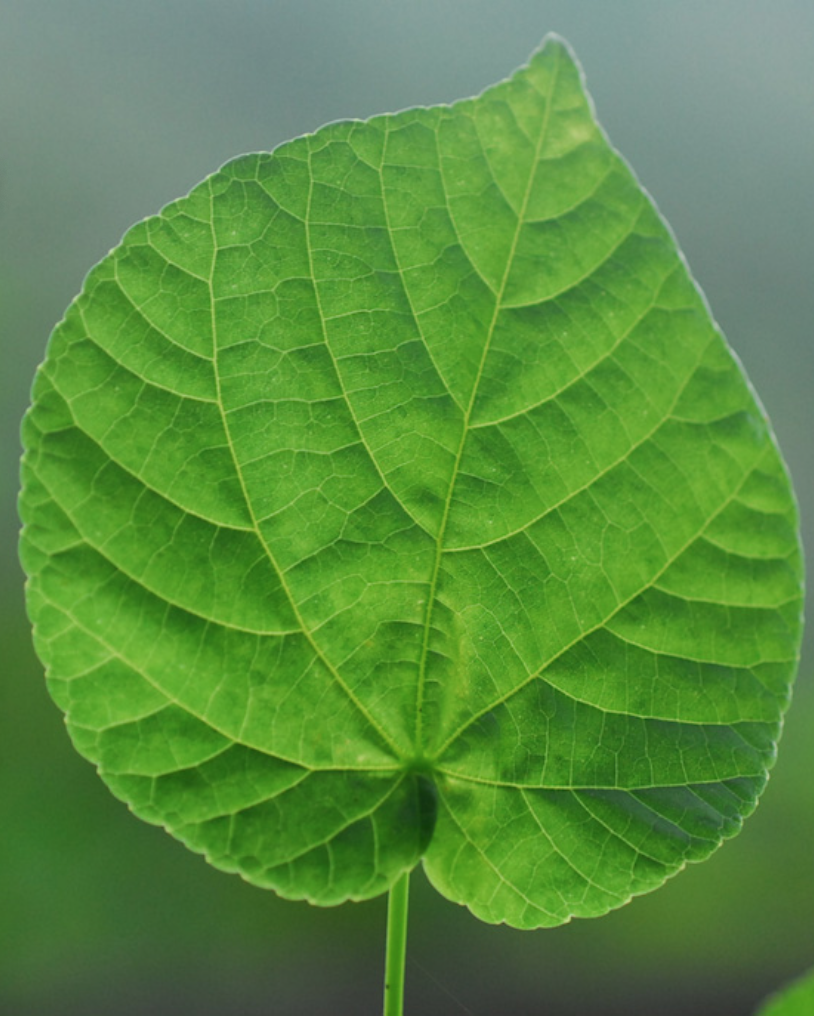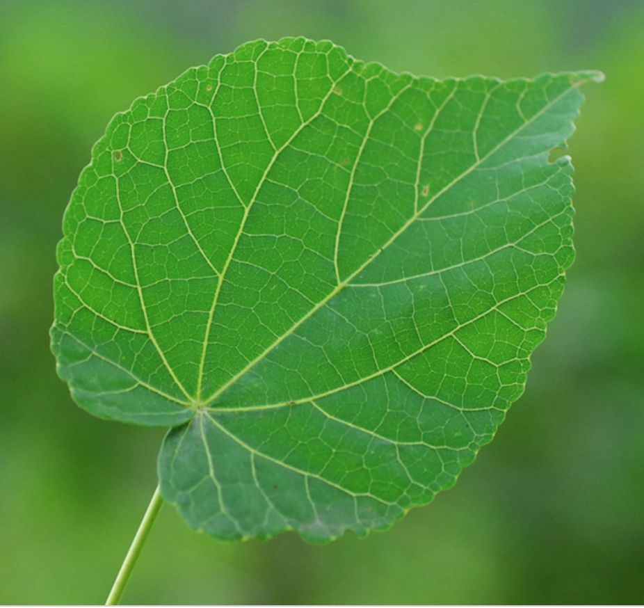 Simples, alternes. Limbe assez largement ovale, cordé à la base, acuminé au sommet. Marge crénelée. Les 2 faces sont pratiquement glabres. Présence de stipules devenant caduques et portant de petites glandes. 7 à 9 nervures,