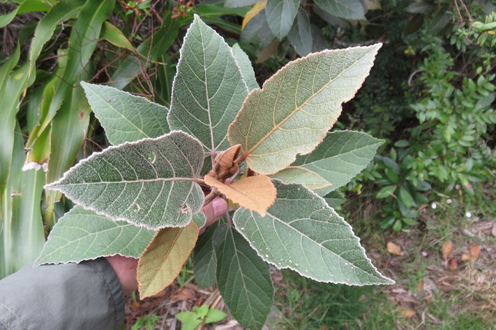 Simples, alternes. Limbe ovale à subcirculaire, cordé à la base, arrondis ou obtus au sommet, jamais avec 3 pointes, 5 à 7 nervures. Petits poils denses sur la face inférieure. Sphériques, en cymes ("cymes : Inflorescences formées d'un axe principal, terminé par une fleur et portant latéralement un ou plusieurs axes secondaires qui peuvent se ramifier de la même façon." en forme d' ombelles ("ombelles : Inflorescences dans laquelle les pédoncules ou les pédicelles des fleurs, sensiblement de même longueur, rayonnent à partir d'un même point de départ." Blanches, rosâtres.