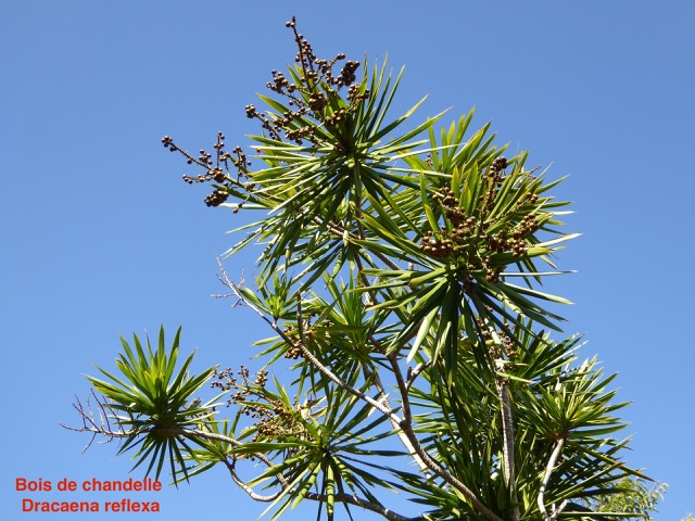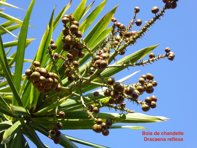En grappes ("grappes : Inflorescences dans laquelle les fleurs sont portées par des pédicelles simples, échelonnés le long d'un axe commun allongé, non ou peu ramifié.") Baies ("Baies : Fruit charnu ou pulpeux, indéhiscent, contenant plusieurs graines, libres dans le tissu charnu." globuleuses de 1 cm de diamètre en moyenne, contenant 1 à 2 graines (rarement 3) englobées dans une pulpe ("pulpe : Chair de certains fruits mous et succulents." Cette espèce est endémique de la Réunion. Elle constitue des peuplements importants entre 100 et 2000 m de haut. Groupe de succession : espèce forestière ("forestière : Espèce de sous-bois ne supportant pas la mise en lumière." Ornement, support de vanille. http://arbres-reunion.cirad.fr/especes/asparagaceae/dracaena_reflexa_lam