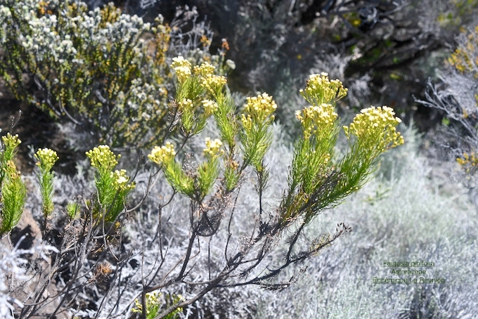 - Faujasia pinifolia Cass. Petit sous-arbrisseau de 50 cm de hauteur à tiges dressées, ramifiées et glabres, à feuillage dense. Espèce endémique de la Réunion. Plante de la végétation éricoïde à 1800-2300 m d'altitude, présente également en forêt mésotherme entre 550 et 1800 m d'altitude, au bord des ravines humides.