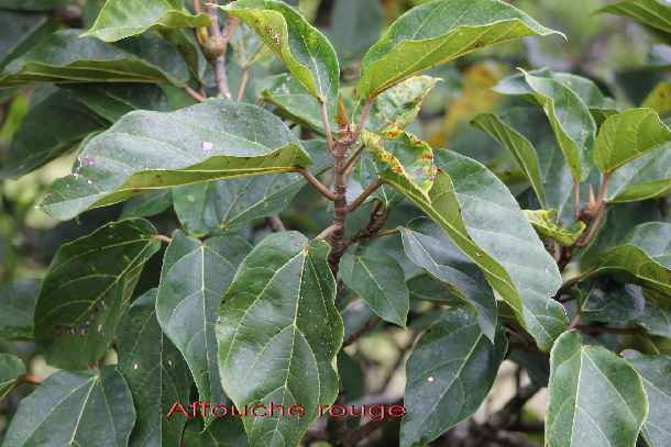 L'Affouche rouge a de grandes feuilles au long pétiole roussâtre. Vous aurez peut-être la chance de voir un rameau fructifère ; ils partent de la base du tronc, ne portent pas de feuilles et courent sur le sol tout autour de |'arbre (endém. Réu. Mau.)