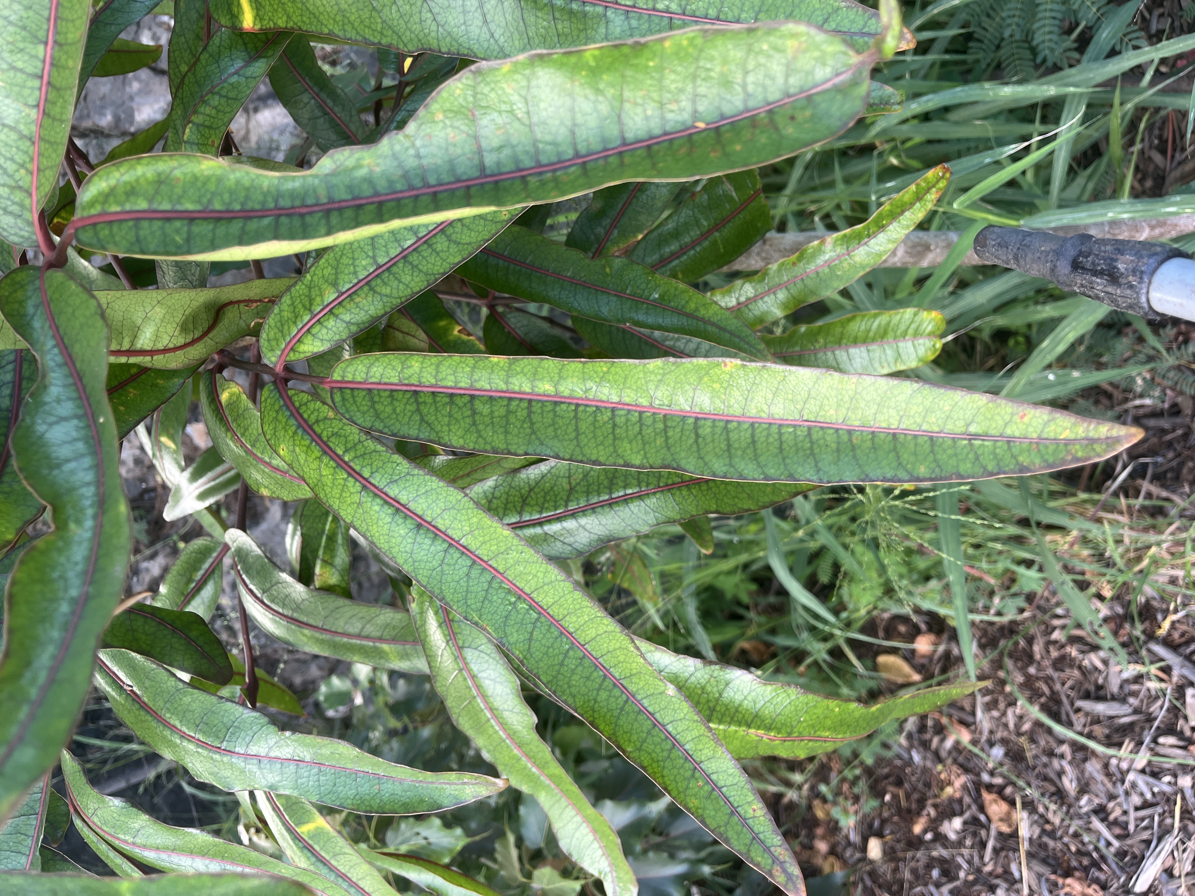 Les folioles juvéniles sont à limbe très étroitement ovale à très étroitement ovale-elliptique de 17 à 20 cm de longueur et de 3 à 5 cm de largeur, à pétiole, rachis et nervure médiane rouge sombre.