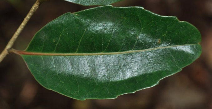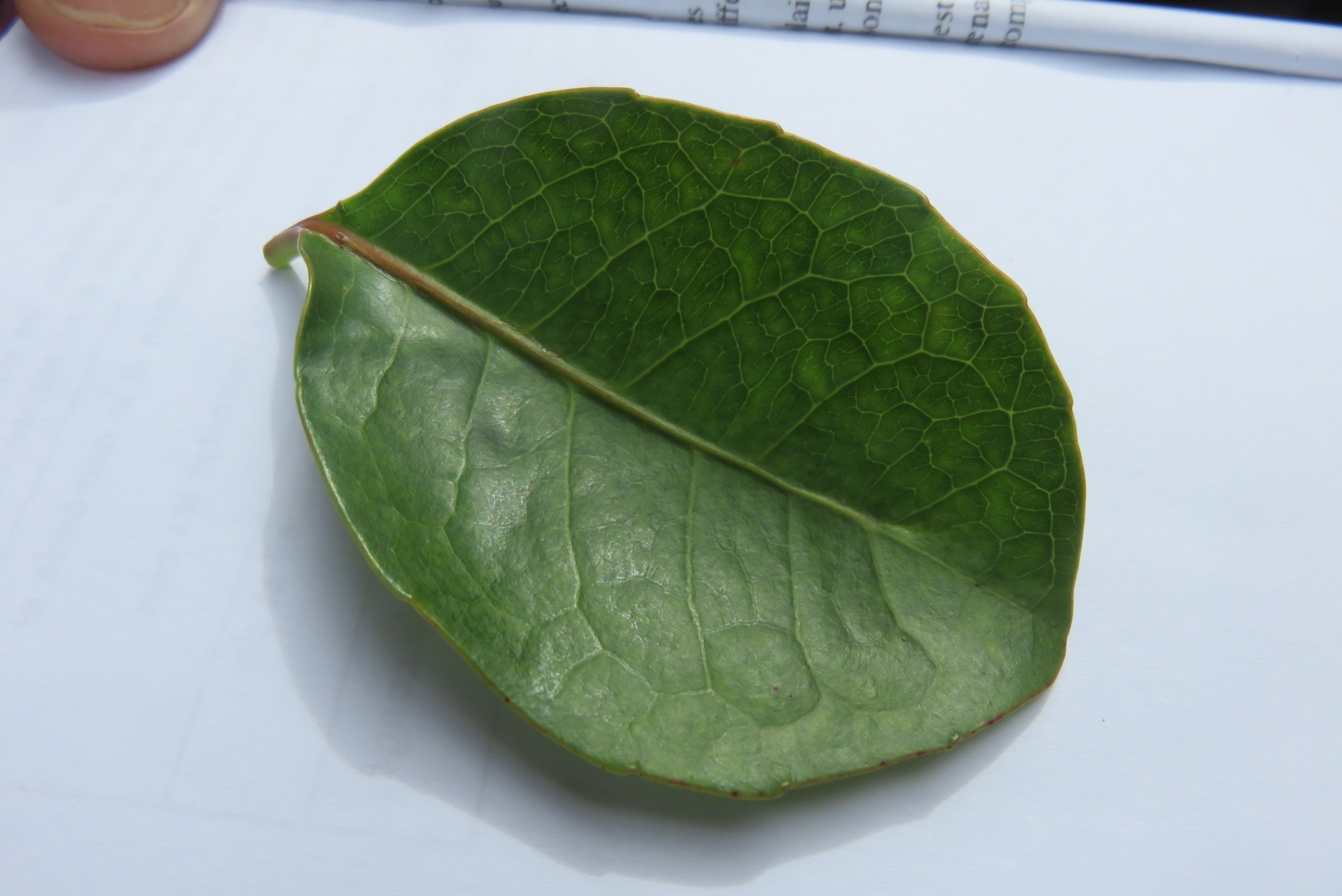 Les feuilles courtement pétiolées sont alternes, simples et entières, les juvéniles plus étroites présentent une nervure principale rouge qui devient verte chez les individus adultes. Le limbe de la feuille adulte est glabre, ovale ou obovale, arrondi au sommet, largement cunéiforme à la base, à marge entière ou parfois grossièrement crénelée. Le pétiole mesure de 5 à 7 mm de long, les stipules sont petites caduques ou plus où moins persistantes.