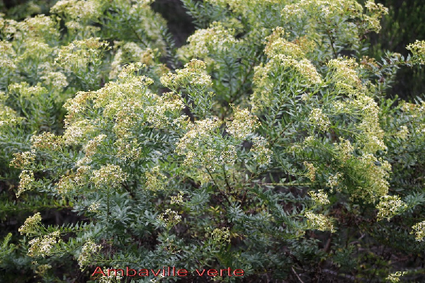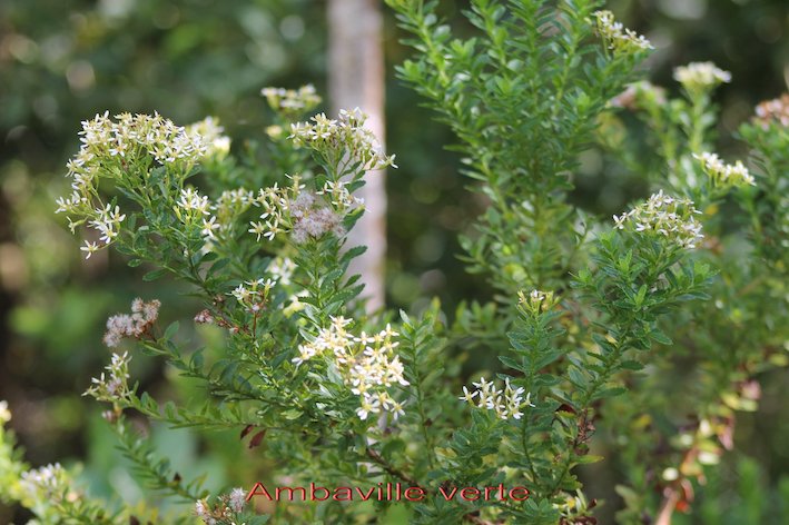 Ambaville a des fleurs presque toute l’année, variable selon les localités, les inflorescences sont abondantes en des groupes terminaux ou sub-terminaux avec de nombreux petits capitules de fleurs unisexuées jaunes ou blanchâtres.