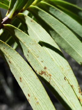 Les feuilles sont opposées, non dentées, étroites, lancéolées, la feuille du fleur jaune des hauts est plus étroite et présente une nervure parallèle. Les feuilles sont insérées sur la tige en quatre rangées.