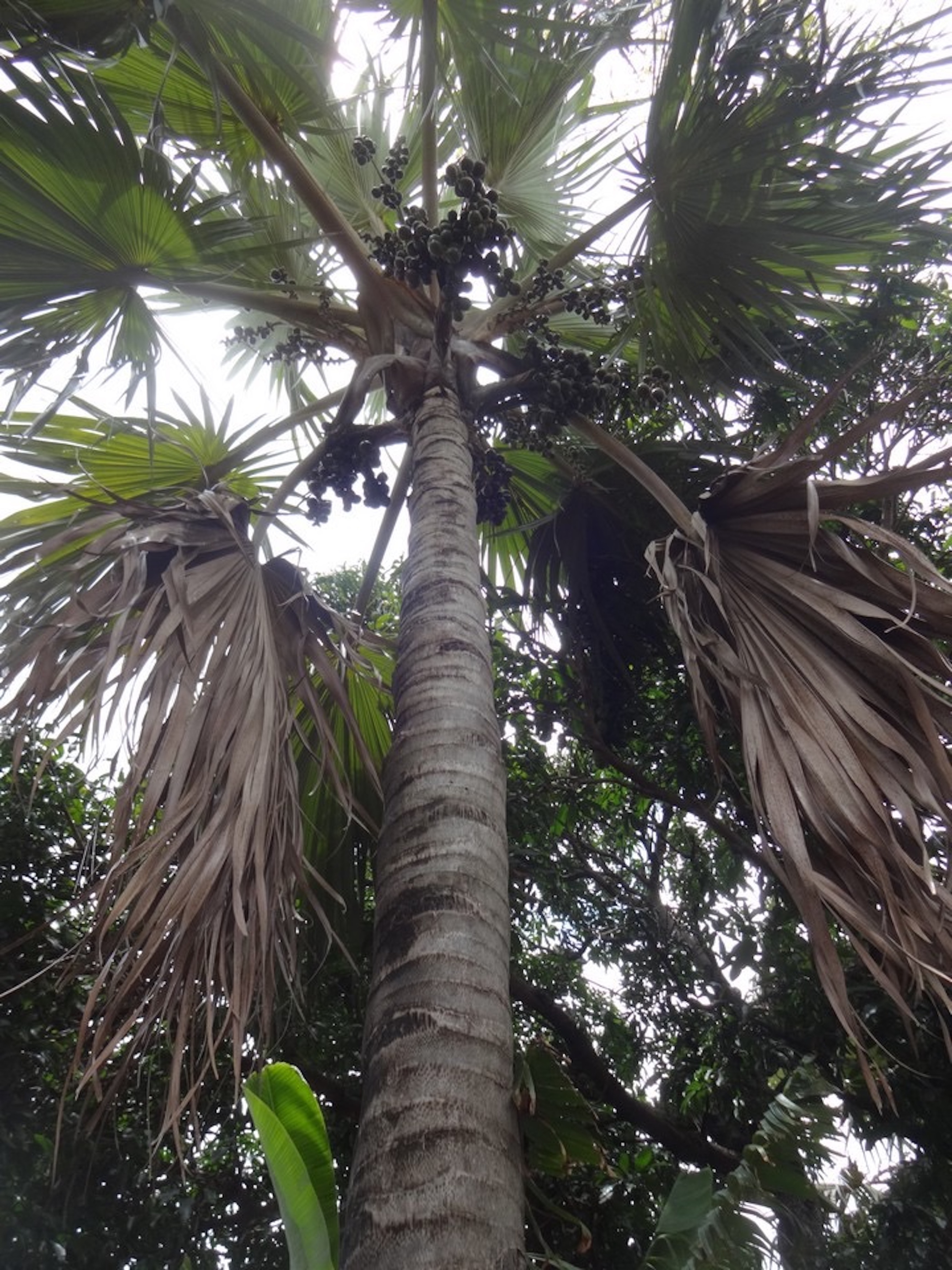 Latania lontaroides (Gaertn.) H.E. Moore., est un palmier dioïque : mâles et femelles poussent séparément. Son stipe pouvant atteindre 12 mètres de haut est fin de teinte grisâtre à noire, souvent à fissures verticales.