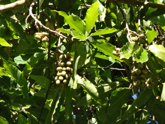 feuilles alternes, elliptiques à oblongues, …, acuminées au sommet, entières, coriaces, longues de 10 à 25 cm … glabres dessus, glauques et pubescentes dessous, à marge ondulée.