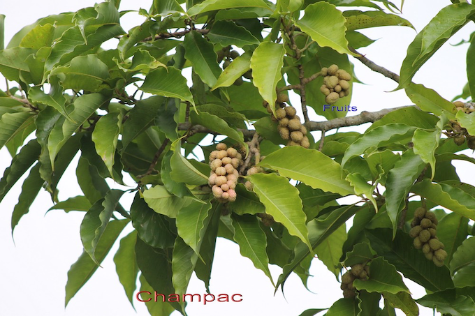 Michelia champaca L. ou Magnolia champaca est un arbre qui mesure environ 15 mètres de haut, avec un magnifique port pyramidal. Son tronc est droit et à l'écorce lisse, de couleur gris clair. Son bois parfait au grain serré et au très beau poli est utilisé en ébénisterie, il est vert nuancé allant parfois pour certaines parties au violet. Il dégage une odeur d'amande à l'usinage.