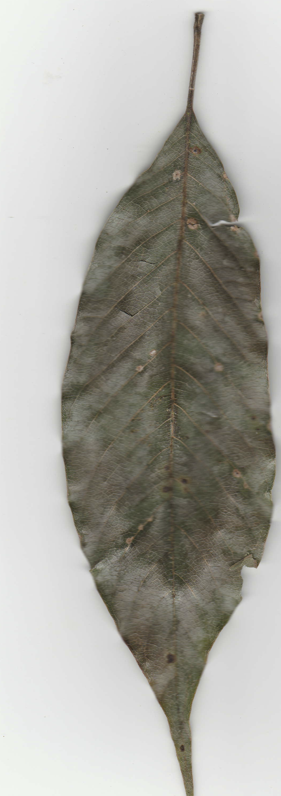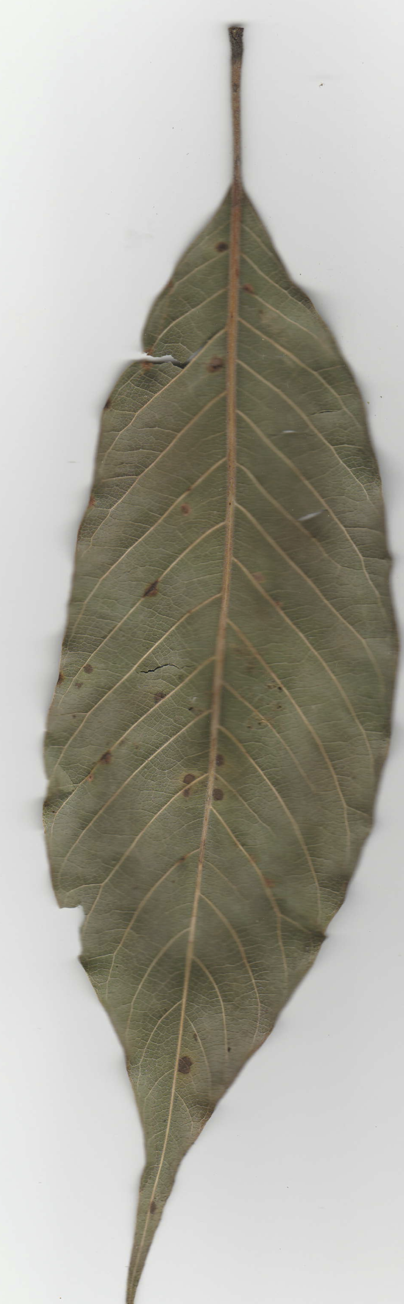Son feuillage est persistant. Les feuilles sont portées par un pétiole de 20 à 40 mm de long, elles sont alternes, elliptiques à oblongues, à base arrondie ou cunéiforme, acuminées au sommet, entières, coriaces, longues de 10 à 25 cm et large de 3,5 à 8 cm, vert foncé et glabres dessus, glauques et pubescentes dessous, à marge ondulée.