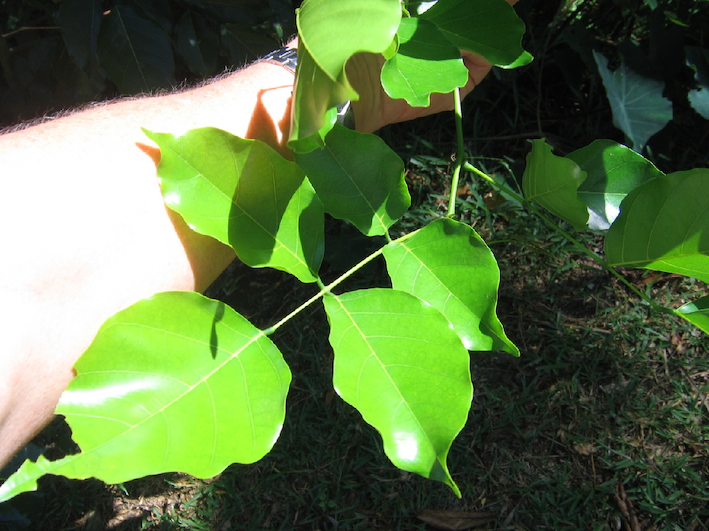 Les feuilles alternes sont composées, imparipennées, à trois ou cinq folioles. La foliole vert foncé et brillante est ovale, à la base arrondie ou cunéiforme, à l'apex obtus, acuminé. La marge est entière, les nervures saillantes sur la face supérieure.