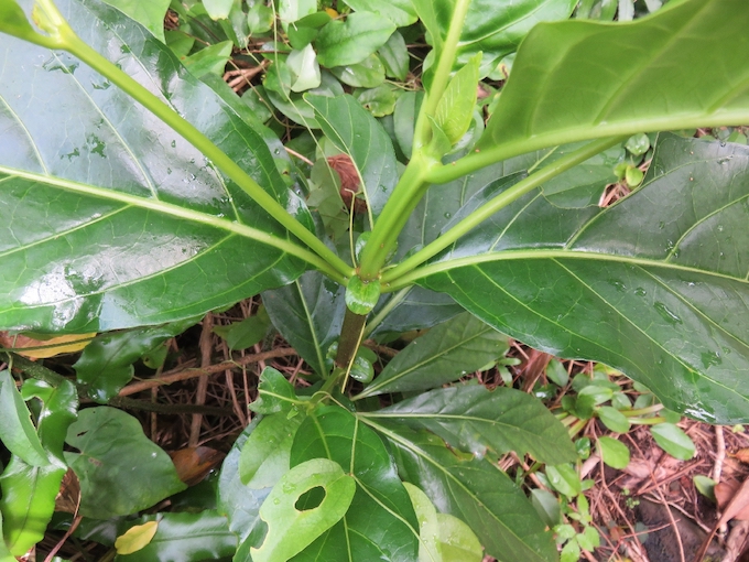 Les feuilles dites citrifolia, de citron, sont persistantes, opposées, environ de 10 à 25 cm de long sur 5 à 18 cm de large, de couleur vert vif luisant, veinées, légèrement coriaces ou charnues, ovales ou elliptiques.
