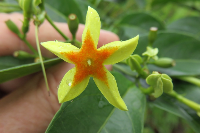 | Fleurs | Très odorantes ; corolle à tube, se terminant en étoile à lobes jaune vif, ornés au centre d'une étoile de poils rouge orangés devenant brun chocolat ; parties sexuées hermaphrodites. |