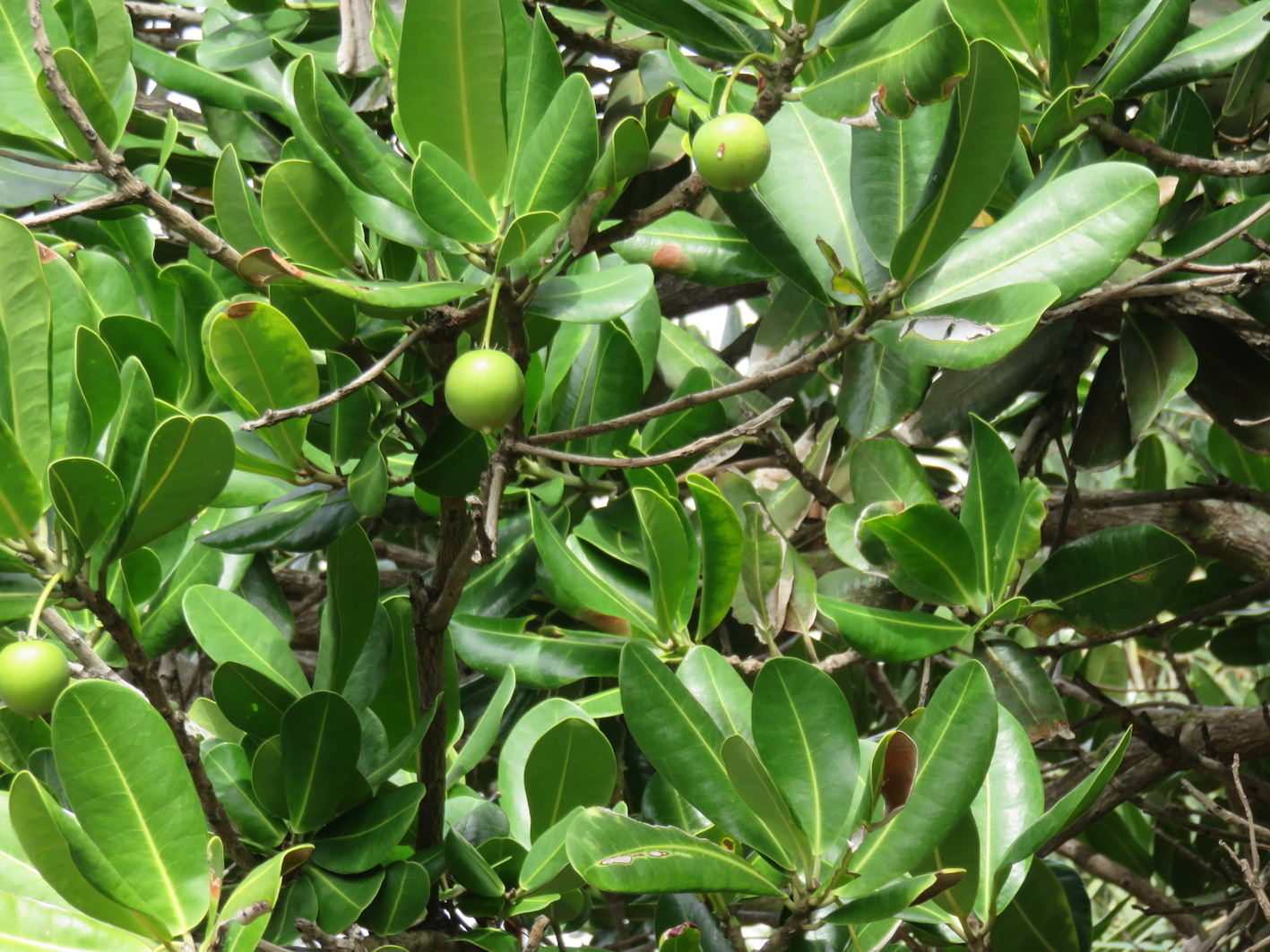 It is an evergreen shrub or small tree growing to 3–15 m tall. It has smooth bark, stout terete branches and flattened terminal twigs. The leaves are opposite, elliptical or obovate, up to 16 cm long and 10 cm broad, with an entire margin and an emarginate (notched) apex. The flowers are small, pale whitish-yellow, fragrant, with a four-lobed corolla. The fruit is a globose to turbinate drupe 2–3 cm diameter, apiculate, bright yellow ripening dark purple, drying hard, dark brown, slightly rough with a single pyriform, dark russet seed, 10–12 mm long. The cotyledons are unequal.[3][4][5]