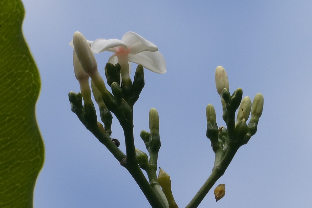 Odorantes, blanches, rappelant celles du frangipanier mais plus petites. Octobre à juin. Follicules ("Follicules : Fruits secs formés à partir d’un seul carpelle et s’ouvrant par une seule fente.") Les graines sont aplaties, de forme et de taille irrégulière selon leur position dans le noyau. Cette espèce est endémique de la Réunion et de Maurice. Elle se trouve en forêt hygrophile de basse altitude ainsi que dans les restes de végétation semi-xérophile.