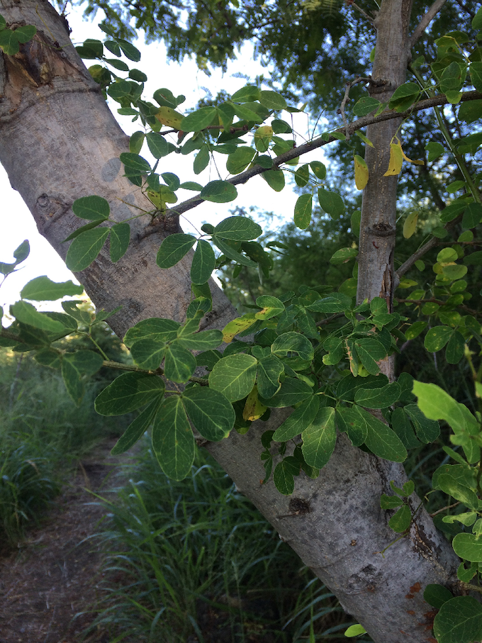 Les feuilles sont en forme d'aile. Chaque feuille est composée de trois à cinq paires de folioles très grandes surtout celles du sommet. Elles sont ovales, entières et en forme de lance. Elles sont supportées par paire par un pétiole commun qui est ailé et articulé. En effet ce pétiole est bordé de chaque côté par une membrane qui commence et finit dans chaque entre-nœud. Vert clair dessus, elles sont nerveuses et légèrement velues dessus.
