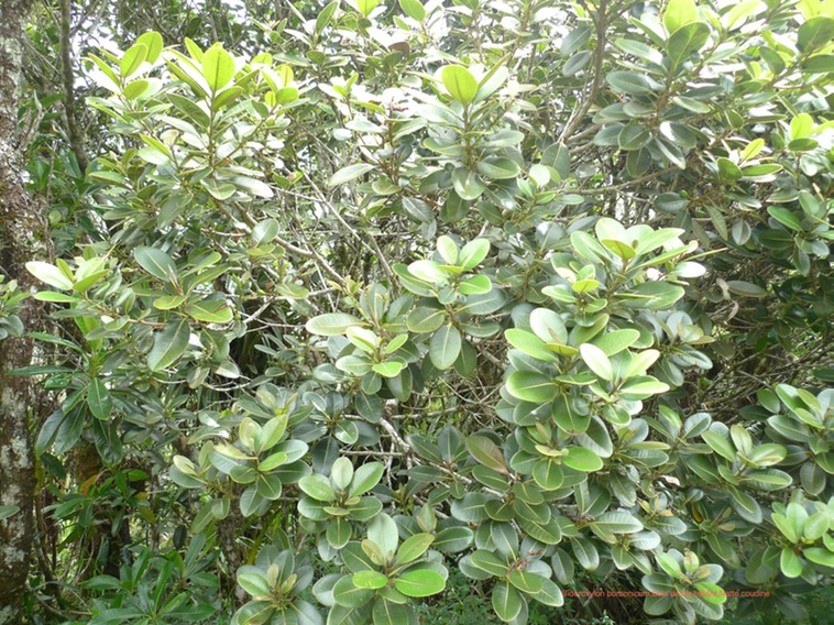 contient du latex* (c'est une Sapotacée). Ses feuilles a bord cartilagineux sont vert clair, luisantes sur le dessus, a nervure médiane encore plus claire. Ses fruits sont noirs et pourvus d'un petit noyau tres dur (endém. Réu.)
