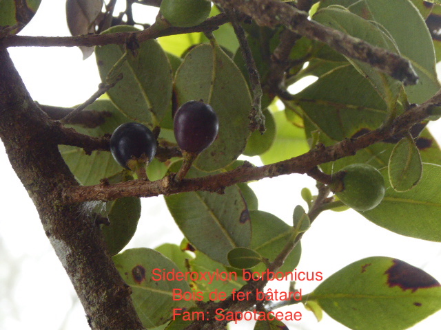 Sideroxylon borbonicum DC., appartient à la famille des Sapotaceae et au genre Sideroxylon L., qui comprend une centaine d'espèces originaires d'Amérique tropicale, de l'Asie, de l'Afrique continentale, de Madagascar, et des Mascareignes.