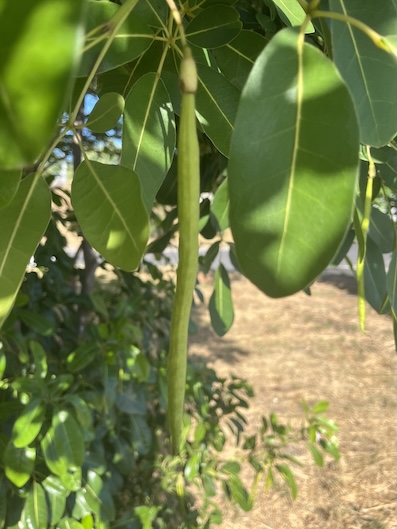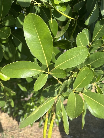 Les feuilles sont composées de cinq folioles à bord lisse, elliptiques vert foncé, opposées de tailles inégales avec de petits poils jaunes sur le dessous. Les deux folioles inférieures étant plus petites et la centrale plus grande.