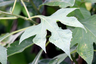 Les feuilles alternes sont portées par un long pétiole, elles mesurent de 10 à 15 cm de long, avec un limbe comportant de 3 à 5 lobes. La nervure centrale bien marquée est blanchâtre, la marge est dentelée.