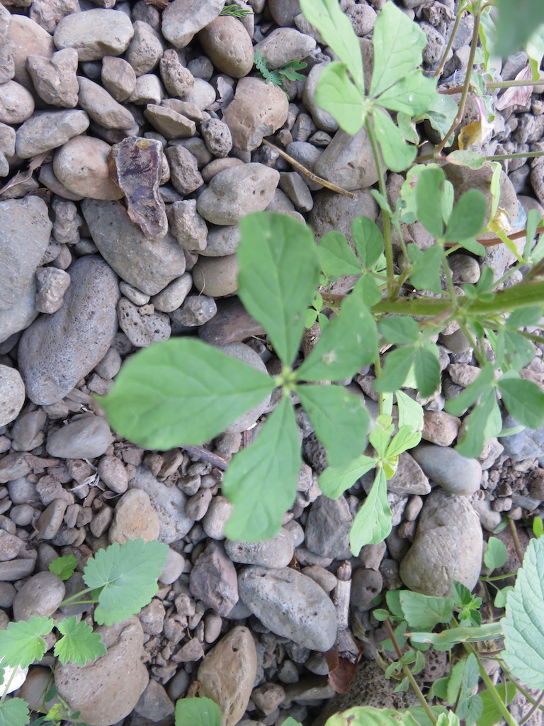 Les feuilles alternes sont portées par un pétiole long de 2 à 5 cm, les stipules sont absentes. Les feuilles sont composées et palmées généralement avec 3 folioles parfois 5. Les folioles de forme obovale au sommet en coin aigu ou arrondi et à base aiguë sont sessiles, avec une marge plus ou moins ondulée et ciliée de poils glanduleux. La foliole médiane est toujours plus grande que les folioles latérales.