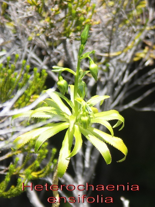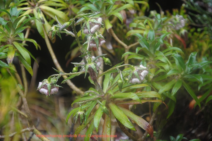 Heterochaenia ensifolia (Lam.) A. DC. Espèce endémique de La Réunion quasi menacée. Espèce polymorphe présente en forêt hygrophile-végétation éricoïde, Cilaos, Plaine des Chigots, Plaine des palmistes. Fleurs violacées, réfléchies à style exert et étamines aussi longues que le tube de la corolle, limbe foliaire denticulé ciliolé à la base.