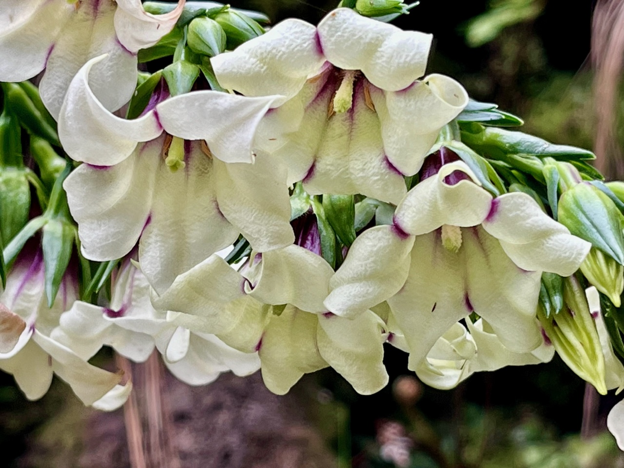 L'inflorescence terminale est formée de grappes groupées en une panicule, atteignant 40 à 60 cm de longueur, large de 15 à 40 cm. Les bractées de la base de l'inflorescence sont semblables au feuilles, celles du sommet plus petites et ciliolées à leur base uniquement. Les fleurs sont violacées à blanc jaunâtre, peu réfléchies. La fleur est portée par un court pédicelle d'environ 1 cm. Le calice est turbiné, à 5 lobes verts, longs d'environ 1 à 2 cm, triangulaires, libres, obliquement dressés, ciliolés dans le 1/3 inférieure. La corolle à pétales soudés en tube d'environ 1 cm de diamètre à la base et long de 2 à 3 cm se termine en lobes triangulaires, étalés ou faiblement révolutés. Les étamines sont nettement plus courtes que le tube de la corolle, carpelles à style plus long que les étamines mais ne dépassant pas le tube de la corolle, se terminant en 3 lobes stigmatiques charnus et incurvés.