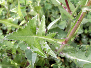 Les feuilles inférieures sont en rosette, de teinte vert clair, les suivantes alternes, oblongues, sinuées-dentées, pennatifides ou souvent indivises et lancéolées, d'aspect épineux, mais peu piquantes, souvent teintée de pourpre, embrassant la tige par 2 oreillettes larges, arrondies, contournées, masquant la tige.