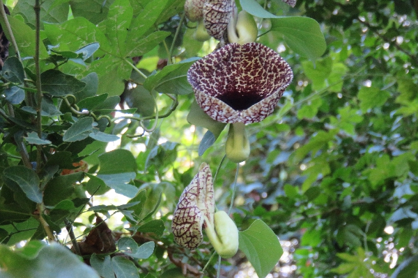 Les fleurs remarquables, marbrées de crème et de bordeaux, recouvertes de petits poils blancs, sont sans pétales comme les autres aristoloches mais avec un calice hyper-développé. Elles sont tubulaires en forme de tête de pélican ou de pipe d'ou l'appellation par les anglophones de Dutchman's pipe.