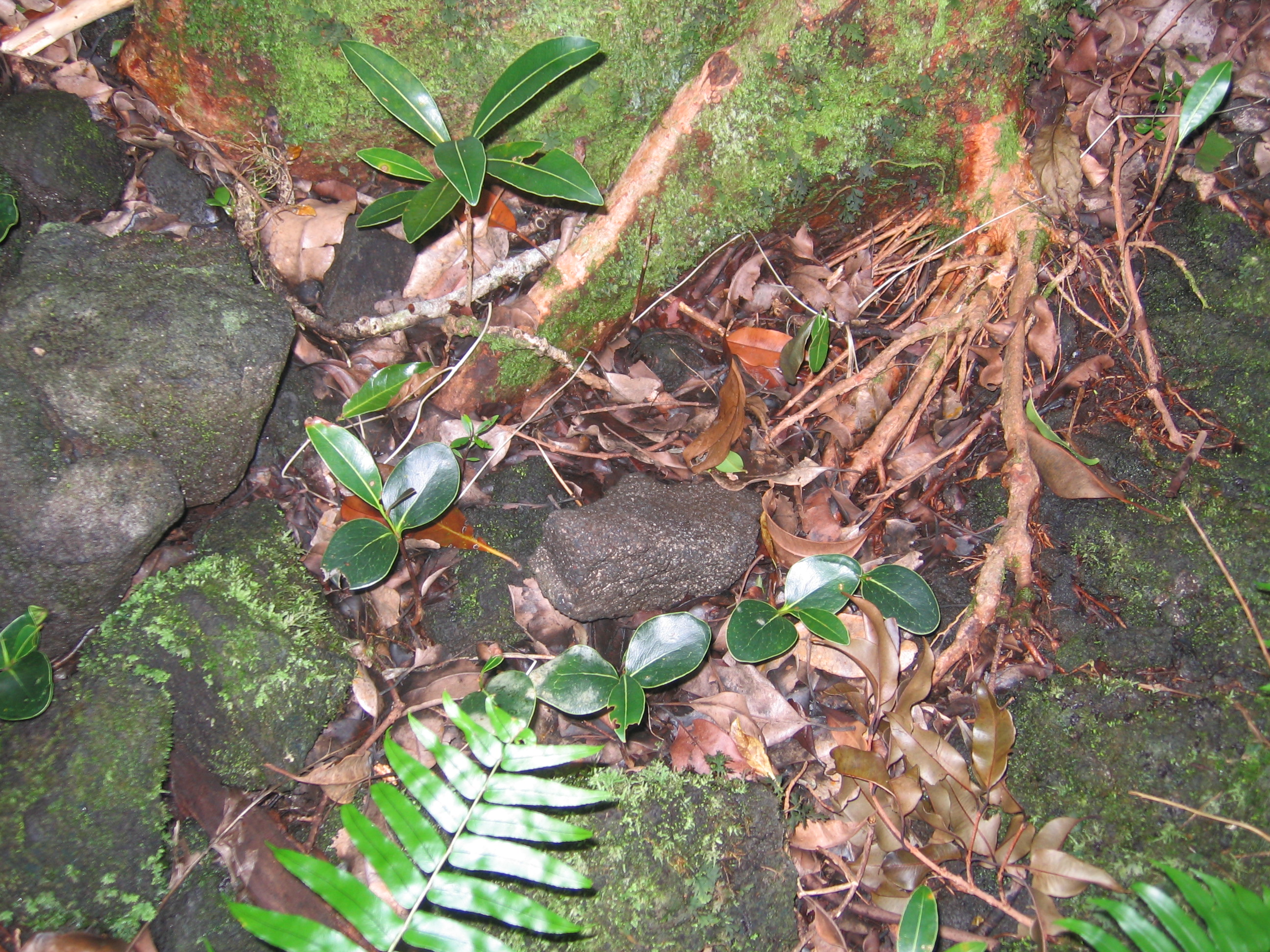 La confusion entre Grand Natte et Petit Natte obsède certains membres du groupe, d'autant plus que selon l'âge des arbres, leur aspect peut changer. Les jeunes individus que l'on trouve ici un peu partout sur le sol permettent de faire quelques distinctions. L'individu le plus grand aux grandes feuilles est un Petit Natte, au dessous les individus plus petits aux feuilles plus petites sont de futurs Grands Nattes. Rather confusing!