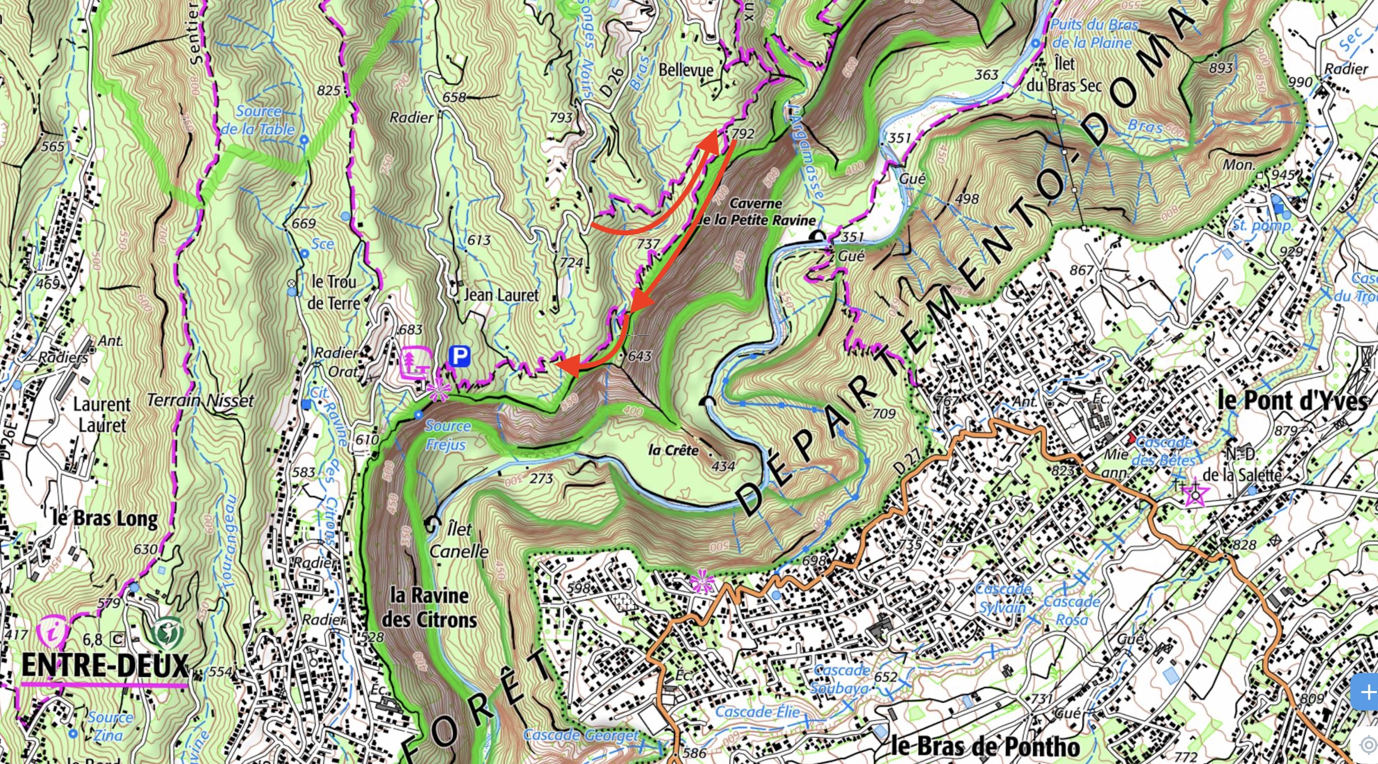 Carte Le début du sentier est marqué par un panneau sur la droite de la route : “Sentier de l’Argamasse”. Peu de place pour garer les voitures.